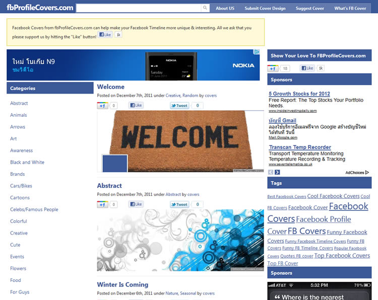 Facebook Profile Cover เว็บไซต์นี้เป็นเว็บที่เตรียมภาพ COver ที่มีขนาดเหมาะพอดีกับการนำไปใช้เป็น Facebook Profile Cover ซึ่งมีให้ดาวโหลดเยอะมากครับ เหมือนดาวโหลด Wallpaper ยังไงอย่างนั้นเลย