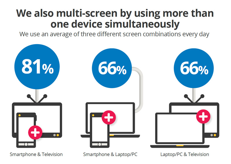 พฤติกรรมของคนยุคใหม่มีหน้าจอมากกว่า 1 หน้าจอแน่นอนทุกคนไม่เถียงเพราะอย่างน้อยต้องมีทีวี 1 อย่าง + กับมือถือ เป็นเรื่องปกติทั่วไป และนอกจากมือถือกับโทรทัศน์แล้วก็จะมี มือถือกับ คอมพิวเตอร์ และแท็ปเล็ตซึ่งการใช้งานสองถึงสามหน้าจอไปพร้อมๆ กันในยุคนี้เป็นเรื่องสุดจะไม่แปลกไม่เชื่อถามตัวเองดูดิ