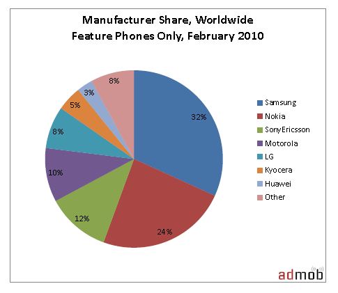 ส่วนแบ่งตลาดของ FeaturePhone Samsung ครองอันดับหนึ่ง 32% รองลงมาคือ Nokia 24% SonyEricson 12%