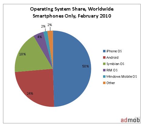 มาดูเรื่อง OS กันบ้างครับ iOS ของ Apple ที่อยู่บน iPod Touch, iPhone กินส่วนแบ่งถึง 50% , Android กินไป 24% และ Symbian OS 18%, BlackBerry (RIM) มี 4% ในส่วนนี้กราฟเปรียบเทียบย้อนหลังไป 3 เดือน iOS จะนิ่งไม่มีการเติบโต มี Android เท่านั้นที่โตขึ้น ข่าวล่าสุด จาก Blognone ก็ยังบอก “Gartner ชี้ Android ขึ้นเป็นเบอร์สองในปี 2010 และอาจโค่น Symbian ได้ปี 2014” ตอนนี้เป็นแล้ว