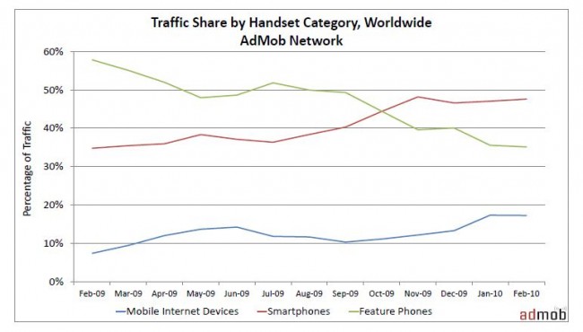 Admob ได้ออกตัวเลขรายงานการลงโฆษณามือถือจากทุกมุมโลกมา มีหลายอย่างที่น่าสนใจ อย่างแรกเลยกับ ประเภทของมือถือที่มี Traffice ในการยิงโฆษณาออกไปของ Admob ตลาด SmartPhone พุ่งสูงขึ้น สวนกลับ Feature Phone ที่ลดลง