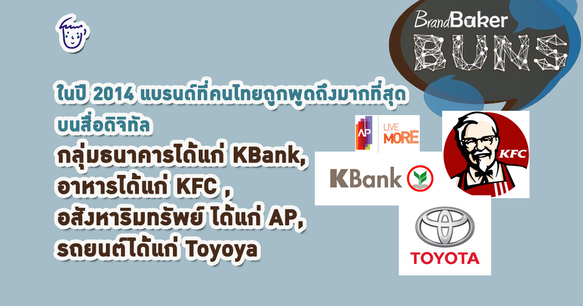 จากการเก็บข้อมูลจากเครื่องมือจัดเก็บข้อมูลที่ชื่อว่า BrandBaker Buns ของบริษัท แบรนด์เบเกอร์ มีการเก็บข้อมูลการพูดถึงแบรนด์สินค้าของคนไทยผ่าน Social Media ใน 5 อุตสาหกรรม ได้แก่ รถยนต์ อาหาร อสังหาริมทรัพย์ที่อยู่อาศัย ธนาคาร ในปี 2014 แบรนด์ที่ถูกพูดถึงมากที่สุด กลุ่มธนาคารได้แก่ KBank, อาหารได้แก่ KFC , อสังหาริมทรัพย์ ได้แก่ AP, รถยนต์ได้แก่ Toyoya