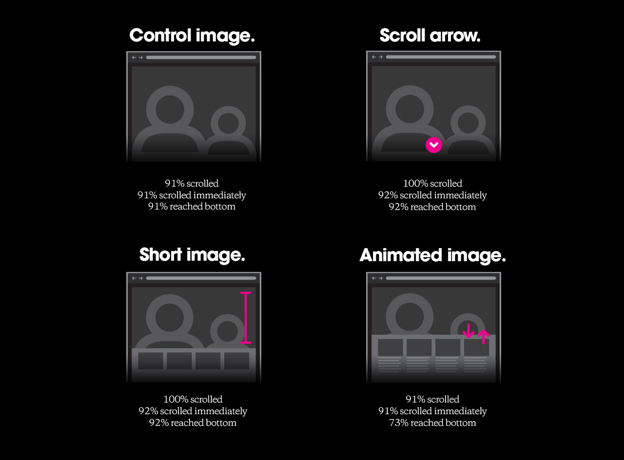 - เวอร์ชั่น ภาพเต็มอิ่มๆ ด้านบนที่หลายเว็บไซต์ทำกันพบว่า 91% ของผู้ชมเลื่อนลงมาและเลื่อนมาถึงด้านล่าง