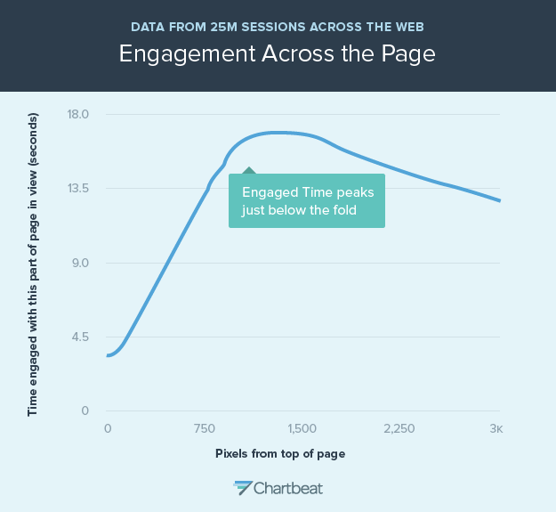 มีความแปลกอย่างนึงของคนเข้าเว็บครับ มีการพบว่า คนส่วนส่วนหนึ่งพอโหลดหน้าเสร็จก็จะทำการ Scroll ลงมาเลย เพราะฉะนั้นทำให้เนื้อหาด้านบนก็จะหายไปส่วนหนึ่ง ประมาณ 20% ของผู้ใช้จะยังอยู่ด้านบนแต่หน้าจะเลื่อนลงมาเล็กน้อย ซึ่งหน้าที่อยู่ ในความสูง 550 Pixel เป็นส่วนที่ผู้ชมเห็นมากที่สุด ส่วนนี้เป็น Above The Fold แต่ต้องบอกว่าอีก 50% ของผู้ชมนั้นก็ยังอ่านเนื้อหาที่อยู่ต่ำกว่า 1500 Pixel สรุปจากกราฟที่เห็นบอกว่า 70% ของผู้เข้าชม Scroll ลงไปอ่านเนื้อหาด่านล่าง