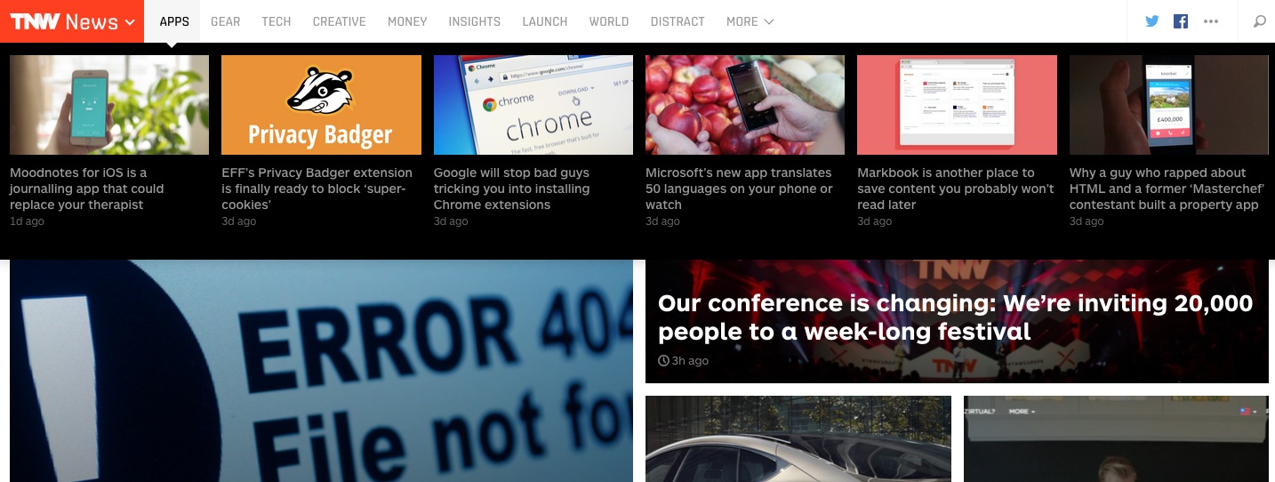 การวางเมนูของ TNW นั่นค่อนข้างงงหน่อย ที่งงเพราะว่า เมื่อเข้าไปเว็บอื่นๆ ภายใต้ในเครือของ TWN นั้นไม่ได้มีความเชื่อมโยงกันเท่าไหร่ ซึ่งคิดว่าคงมีการปรัเมนูของเว็บอื่นๆ ในอนาคต เมนูภายใต้โลโก้ทีมงานวางเป็นเมนูที่ทำให้ผู้ใช้เข้าถึงเว็บอื่นๆ ในเครือซึ่งเดาได้ว่าต้องการเพิ่มทราฟฟิกไปยังเว็บไซต์นั้นๆโดยตรงดูจากการให้ความสำคัญ และเมนูด้านบนคือหมวดหมู่ข่าว ที่นำเสนอเป็น Huge Menu ตามเว็บข่าวๆ หลายๆ ที่ ซึ่งการวาง Navigation ของการดีไซน์ครั้งนี้ไม่ค่อยฉีกกฏอาจจะยังคงความคุ้นชินของผู้ใช้เดิมไว้ให้มากที่สุดในเรื่อง Navigation