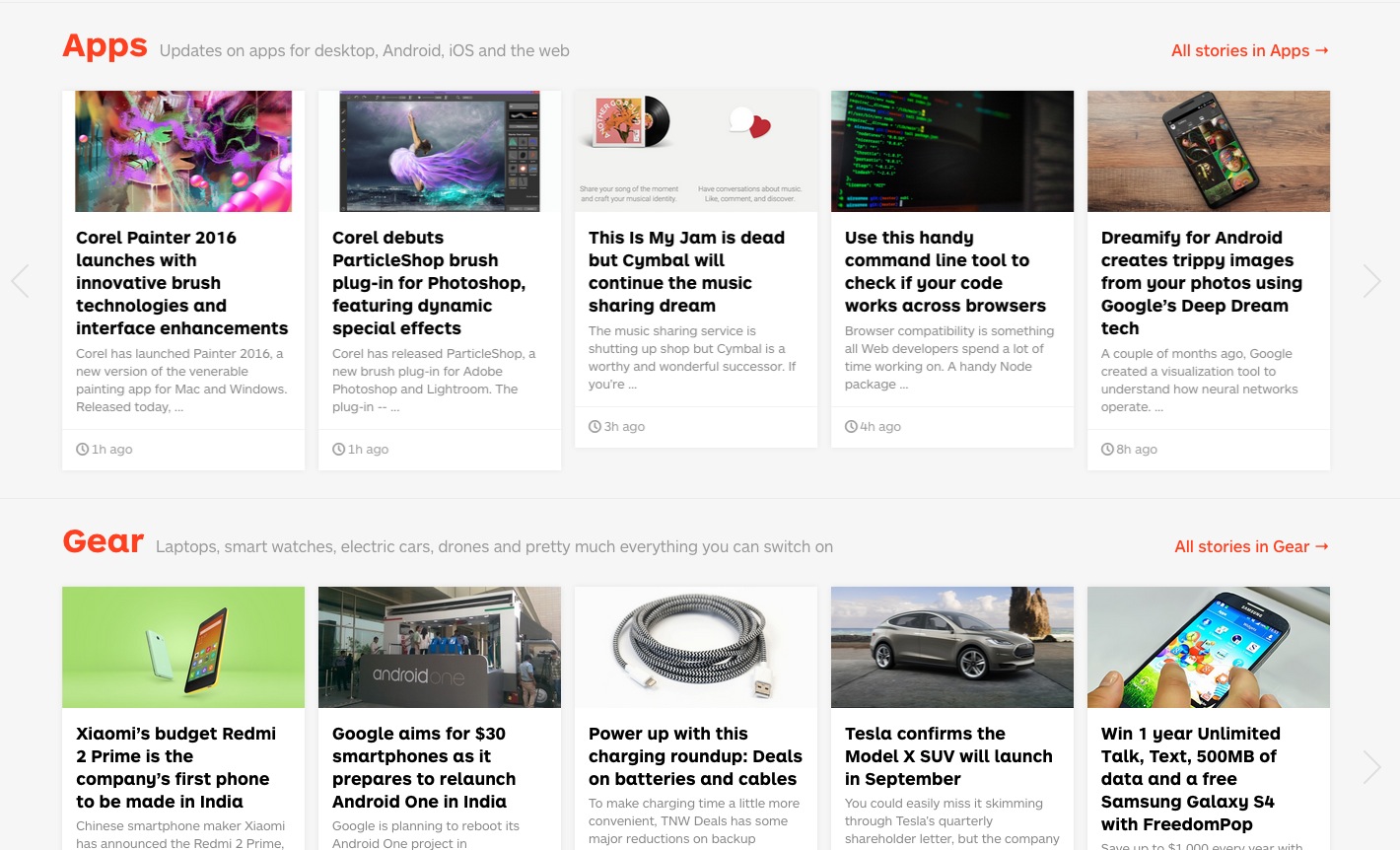 สิ่งที่เว็บข่าวเป็นมาตลอดเลยก็คือเนื้อหาของข่าว ข้อมูลต่อวันที่มีมากจนหลายครั้งผู้ใช้จะพลาดข่าวๆ สำคัญๆ ไปจากหน้าแรกเพราะมันจะถูกผลักออกไปหน้าในด้วยข่าวที่ใหม่กว่า พื้นที่ส่วนที่ทำให้ Hilight ของข่าวหรือ Sponsored ยังต้องอยู่ภายในหน้าแรก Hilight Articles ของเว็บ TNW สามารถปรับเปลี่ยนได้ 6 รูปแบบ โดย บรรณาธิการเว็บสามารถเลือกรูปแบบและเลือกข่าวขึ้นมาส่วนนี้ได้เอง ในส่วนนี้ Cover Hero Sections นี้จะไม่ได้เลือกเนื้อหาล่าสุด แต่เลือกเนื้อหาที่ผู้ใช้ จะเข้ามาอ่านโดยเป็นการคัดสรรเรื่องที่น่าสนใจเพิ่มความรู้สึกเป็นหน้าแรก ที่ทุกคนจะไม่ได้รับประสบการณ์แบบนี้จากหน้าอื่นๆ เสมือน ‘frontpage time’ ที่ทุกคนจะได้ประสบการณ์นี้ ซึ่งส่วนนี้เหมือนๆ กับเว็บอื่นๆ อย่าง HBR, USAToday แต่เว็บอื่นๆ ก็มีกลยุทธ์ต่างกัน Mashable แตกต่างออกไปเล่นเรื่อง Trending มาเป็นตัวเลือกเพื่อให้หน้าแรกน่าสนใจมากขึ้น ใช้เครื่องมือ Social Share เป็นตัวคัดกรอง (มีระบบ MashShare ช่วย Support)