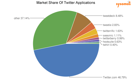 แถมด้วยข้อมูล Market Share ของ Twitter Client ที่ Tweet Deck สูงมาเป็นอันดับหนึ่ง 8.48% ในส่วนของ other 37% คือการดึง API ของ Twitter ไปใช้แล้ว Tweet ขึ้นทวิตเตอร์ ตามเว็บไซต์แคมเปญ และช่องทางต่างๆ