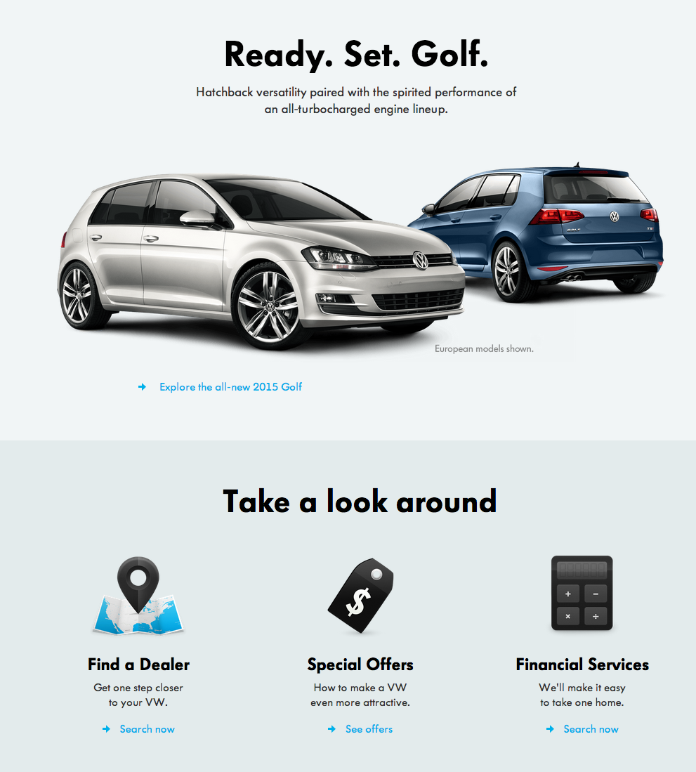 สินค้าในอุตสาหกรรมรถยนต์ เป็นสินค้าที่อยู่ในกลุ่ม High Involvement ต้องใช้การตัดสินใจการซื้อสูงมูลค่าสินค้าสูง การตัดสินใจมีหลายปัจจัยเกี่ยวข้อง เครื่องมือยุคดิจิทัลเลยช่วยได้ VW ใช้ Insight ของลูกค้าที่ต้องการรถที่ตอบโจทย์ความต้องการของตัวเอง เลยเสมือนกับการเลือกคู่ เว็บไซต์ใหม่ของ VW เลยมาใน Concept เว็บใหม่เลยเน้นไปที่การเป็นเครื่องมือในการ Match รถของ VW ที่ตรงกับความต้องการให้ที่สุด นำไปสู่การขาย Lead to Sales มีเมนูเน้น Shop Now , Get A Quote,